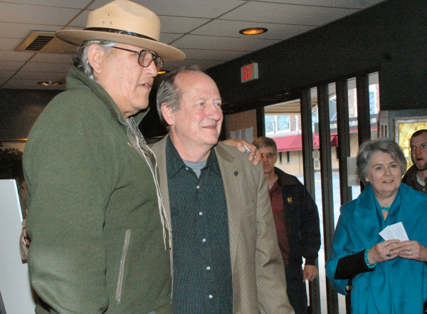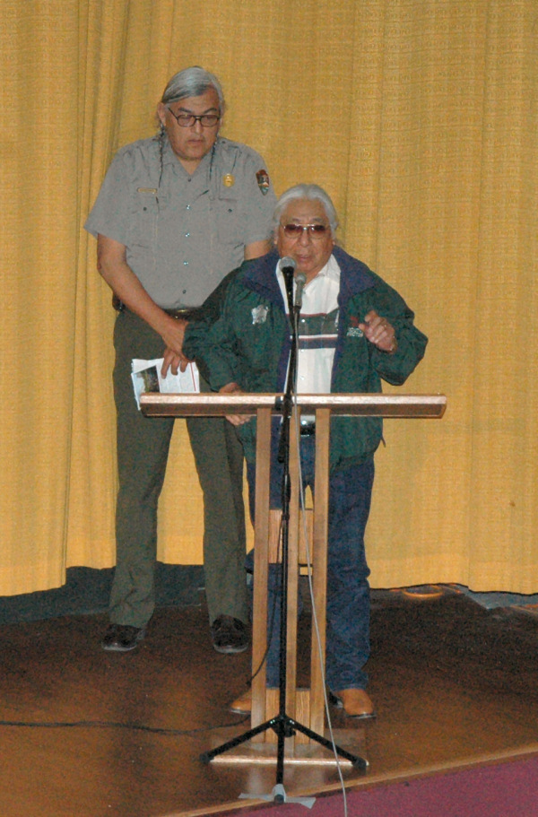 Birgil Kills Straight, Lakota elder, offers a prayer to open the event. Gerard Baker listens before making his own comments.