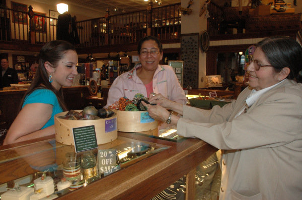 Prairie Edge staff and Jace DeCory admire bracelets